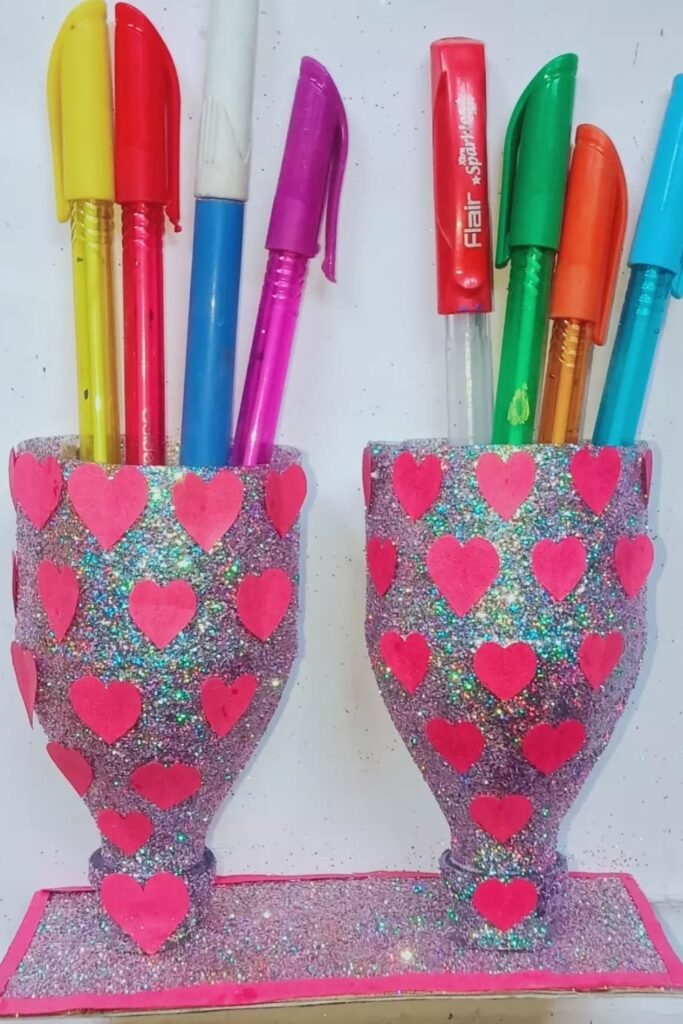 Let your desk feel more personal with a glittered bottle stand decorated with bold heart shapes offering instant visibility for pens you reach often.