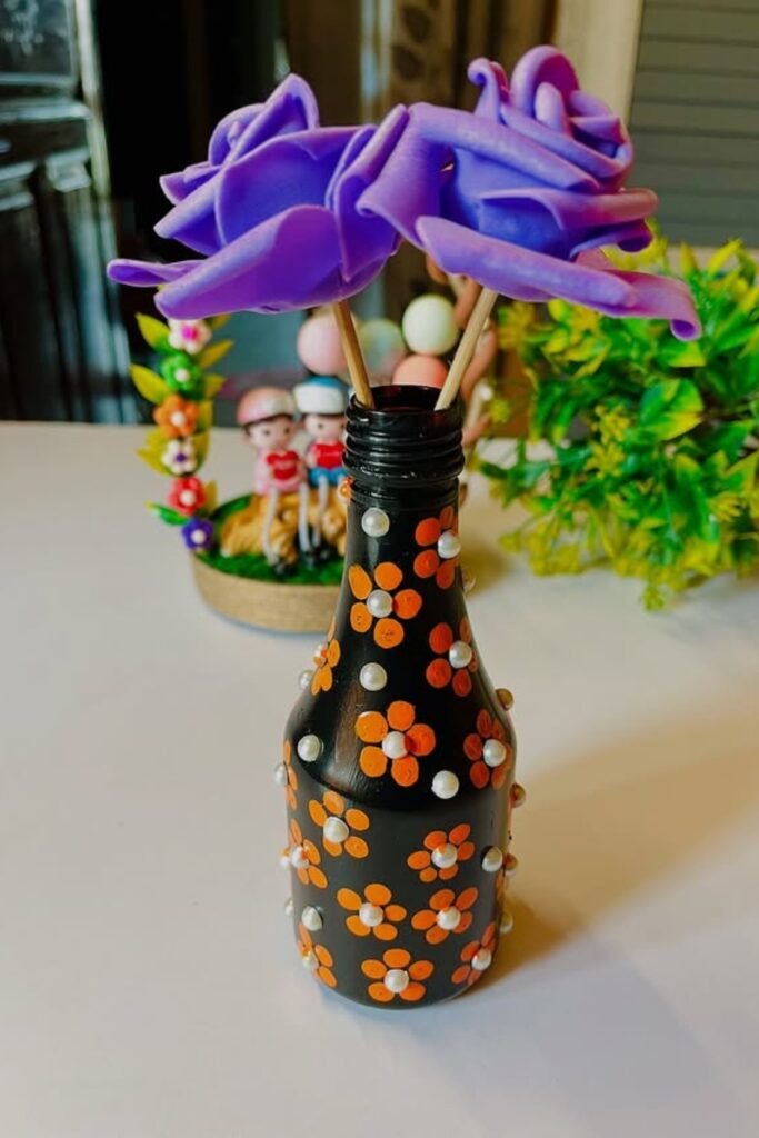 Paint the bottle black for contrast, then add dotted floral patterns using bright orange and white, keeping each detail evenly spaced.