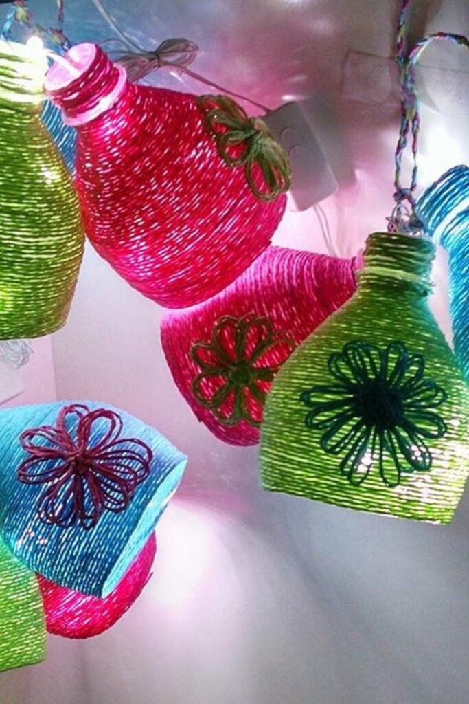 Shape the bottle’s top gently, wrap the entire surface with colorful thread, and ensure even spacing for a bright illuminated effect.