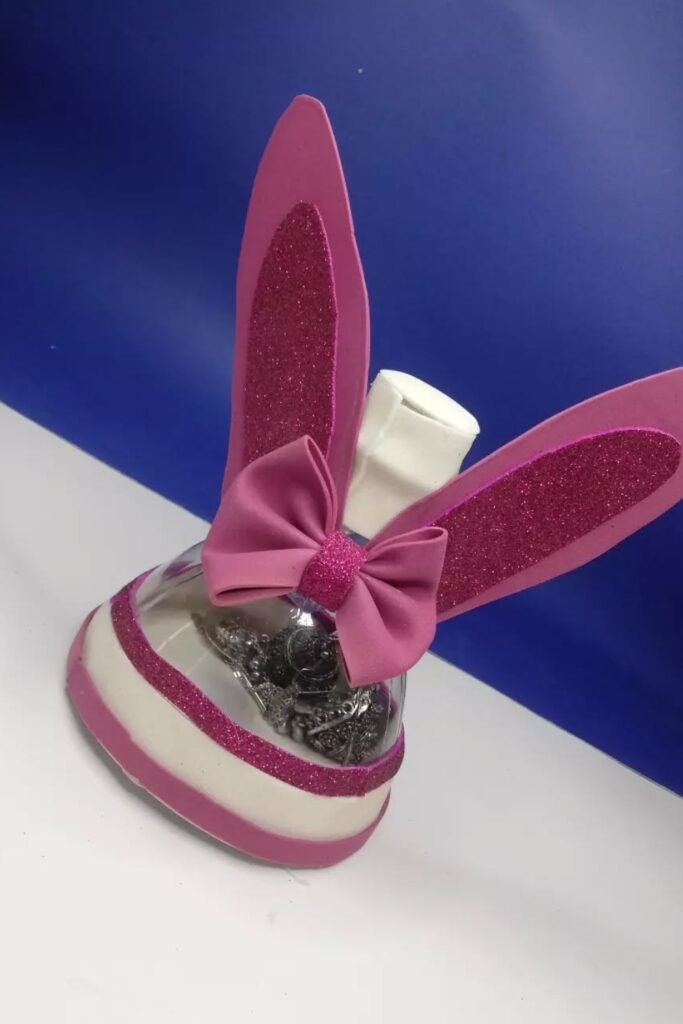 Cut the bottle evenly, decorate the base with white and pink foam strips, and attach tall glitter ears plus a matching bow.