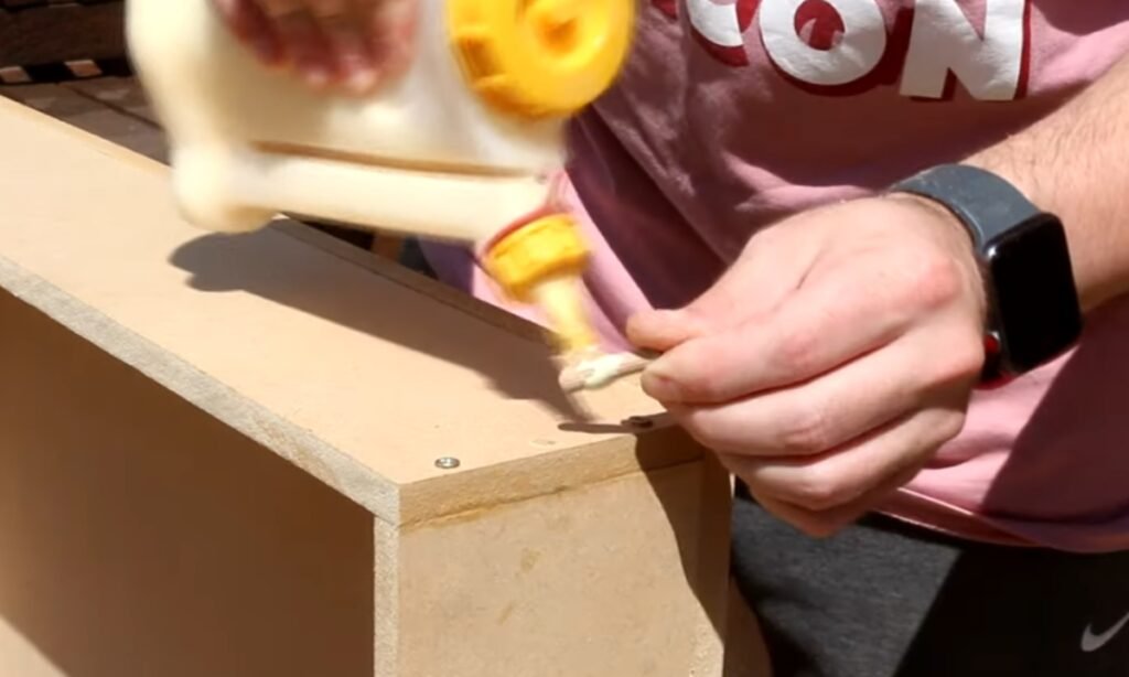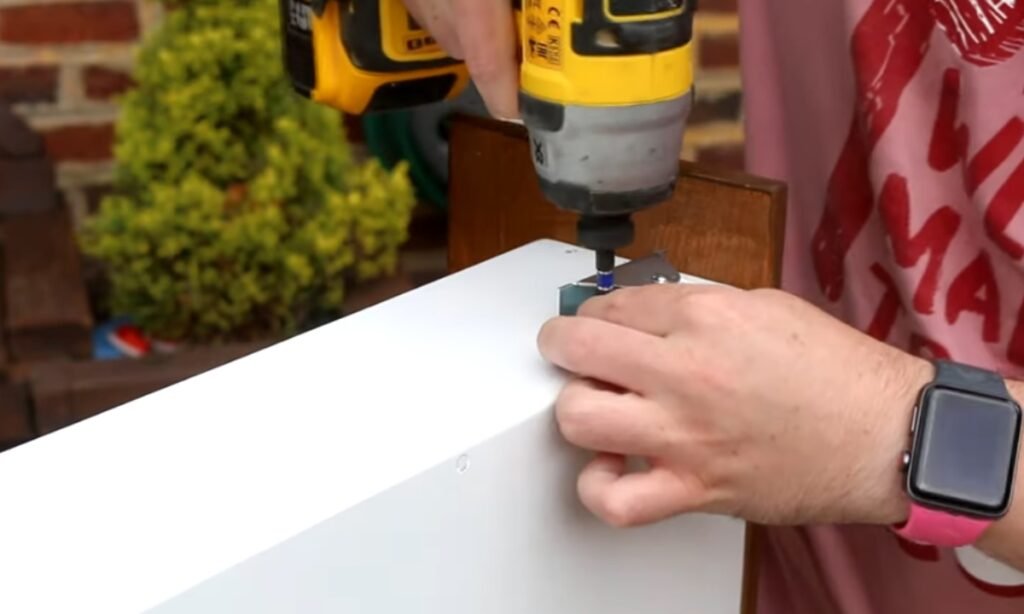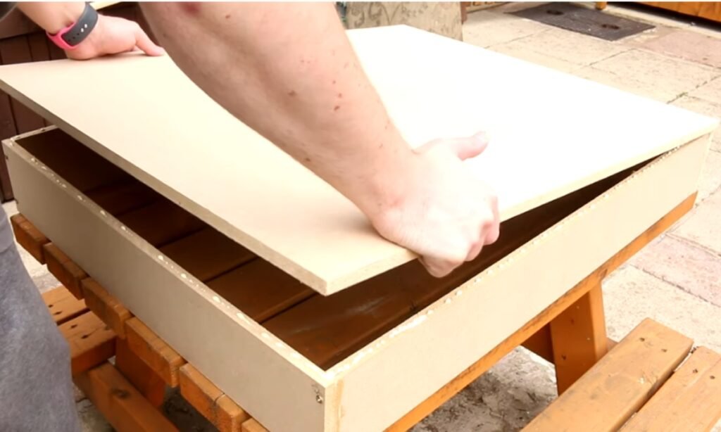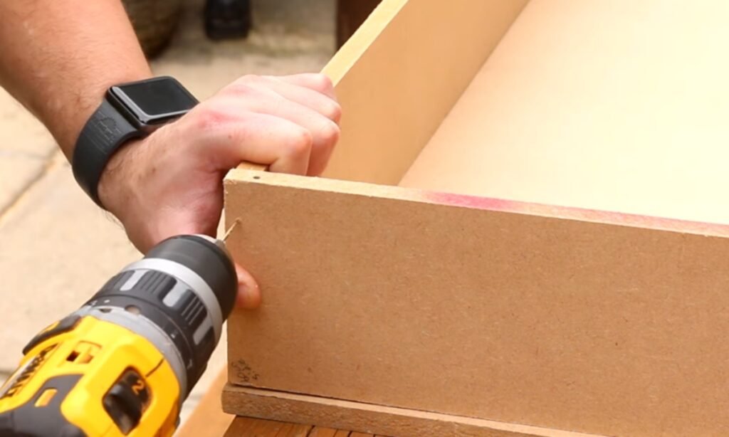 Turn the frame upside down, apply glue along the edges, and attach the bottom panel with screws. This makes a sturdy box that will serve as your drawer.