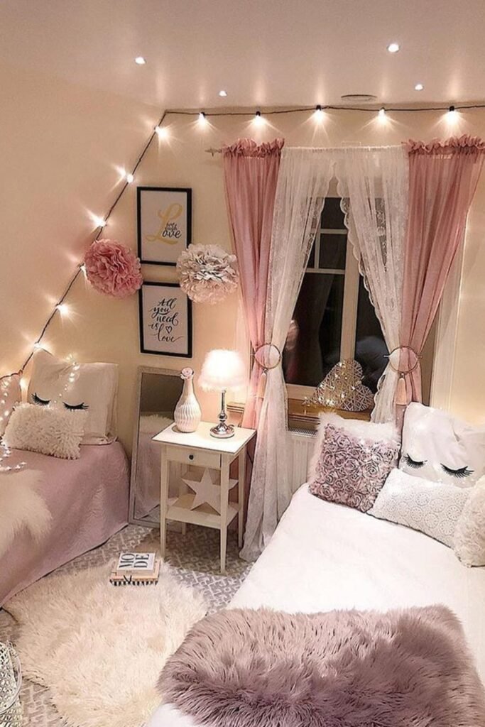 String lights around both beds add a soft sparkle that makes shared bedrooms feel cozy without needing bulky lamps or complicated decorative styling.