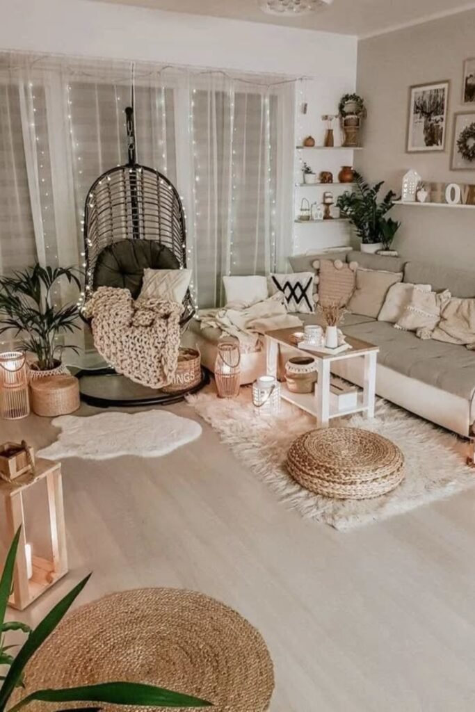 Layer fluffy rugs and soft pillows to enhance warmth, making the room perfect for relaxing evenings, gentle reading moments, and late-night conversations easily.