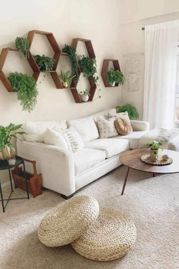 Hexagon shelves filled with trailing plants make blank walls feel intentional, adding height and freshness without needing bulky decorative pieces anywhere.