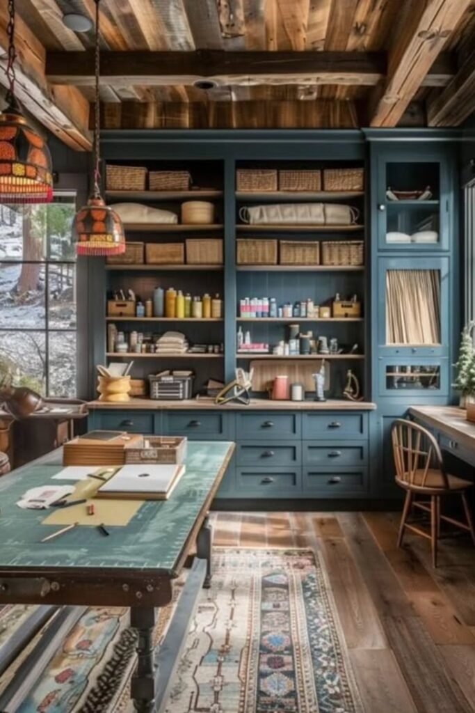 Deep shelves paired with baskets form a practical storage wall that keeps creative tools visible while still giving the room a structured atmosphere.