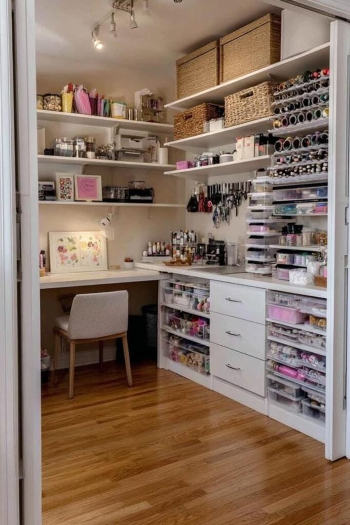 A compact closet transformed into a craft station keeps everything organized, letting you work comfortably without spreading materials across multiple home areas.