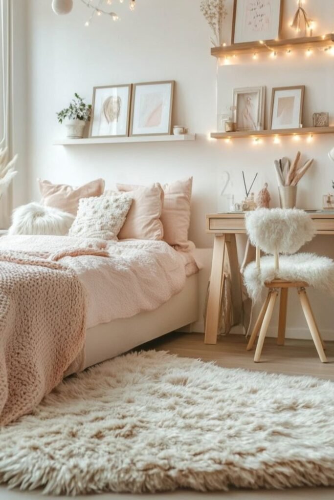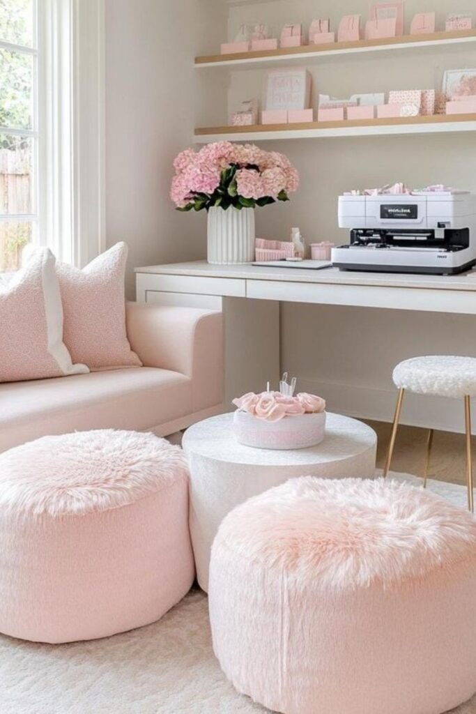 Fluffy poufs and pastel seating pieces help you build a gentle conversation zone that brightens the room without dominating your layout.