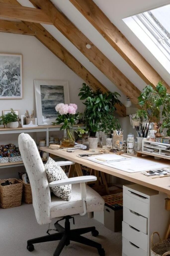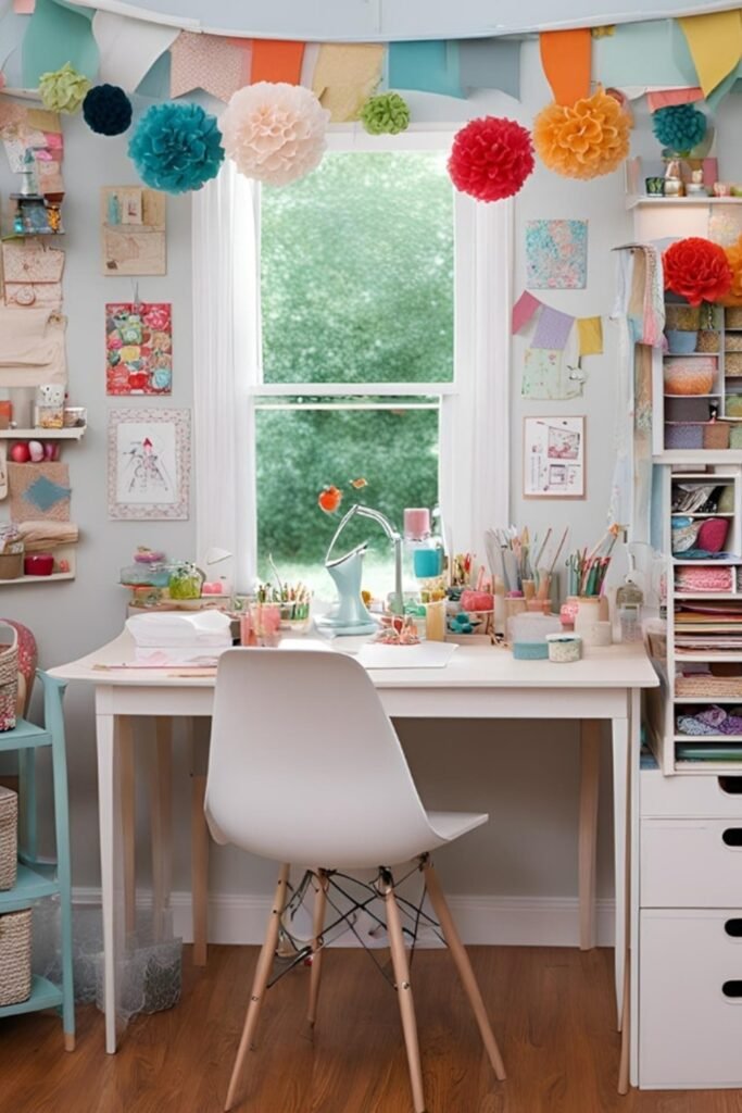Fill your creative corner with layered pinboards, floating shelves, and colorful decor pieces that turn inspiration into an accessible part of the workspace.