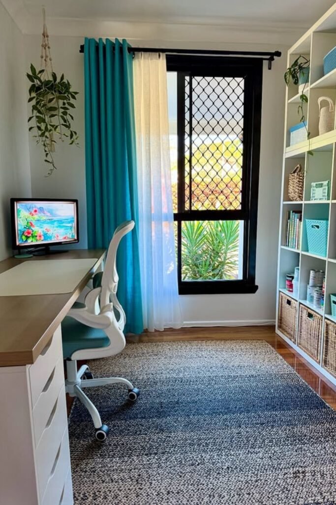 Refresh a home office with teal curtains, white shelving, and woven baskets that deliver storage while keeping the room bright and visually balanced.