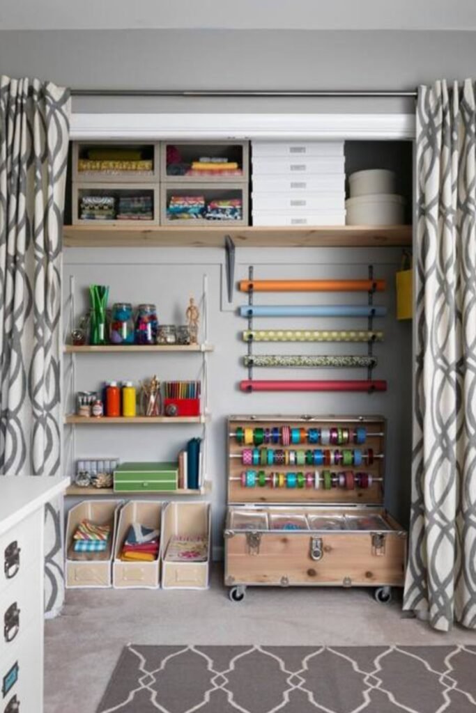Add shelves, clear bins, and simple ribbon rods so every tool stays within reach while still giving the closet a tidy layout.