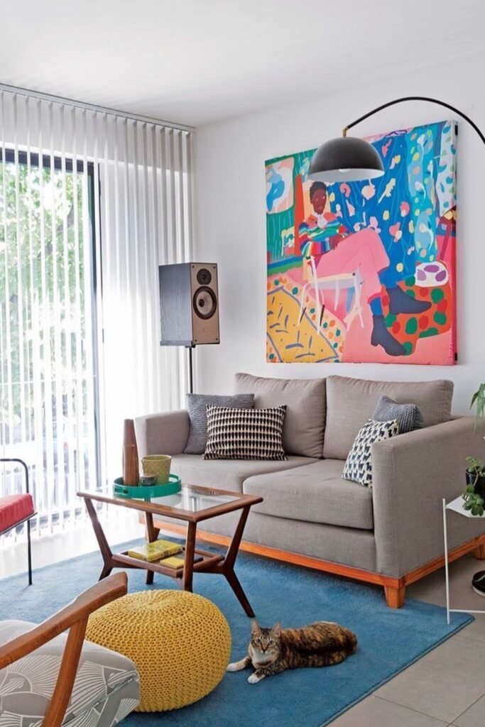 Pair the art with minimal pillows and a bright accent piece, allowing the colors to guide how you organize your surrounding decor choices naturally.