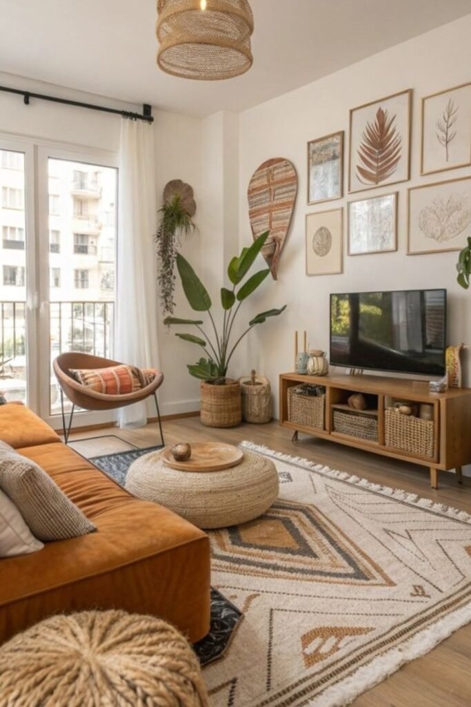 Earthy baskets, woven stools, and leaf prints help create a warm living space that feels grounded without relying on heavy decorative items.