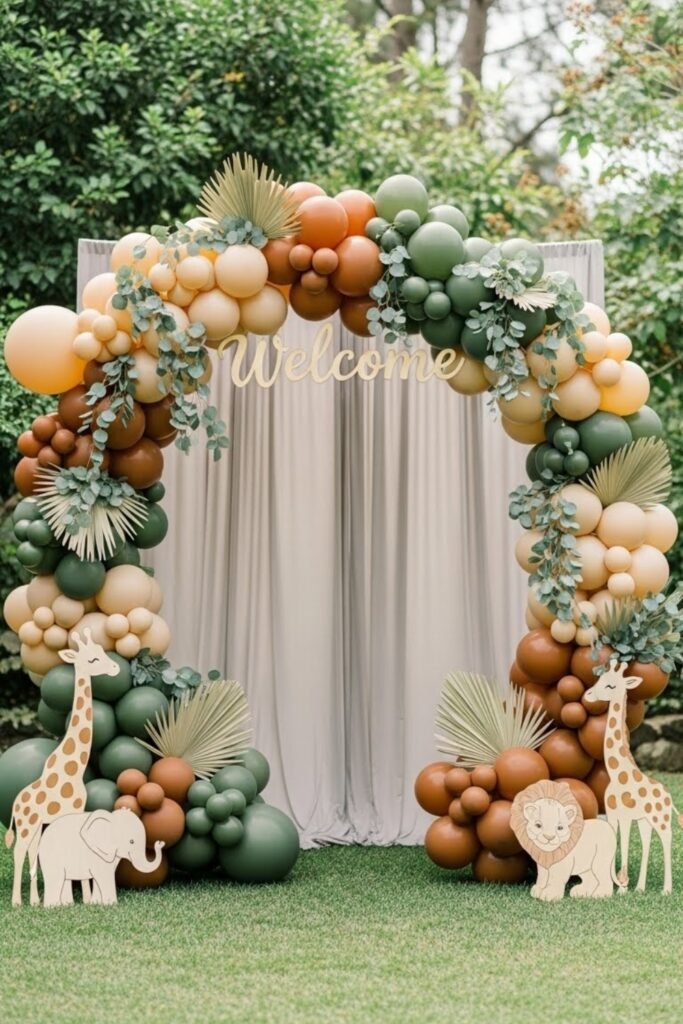 Set the tone right at the entrance with a safari-inspired arch using earthy balloons, faux vines, and wooden animal accents. Keep the colors soft and natural to avoid a cartoon look.