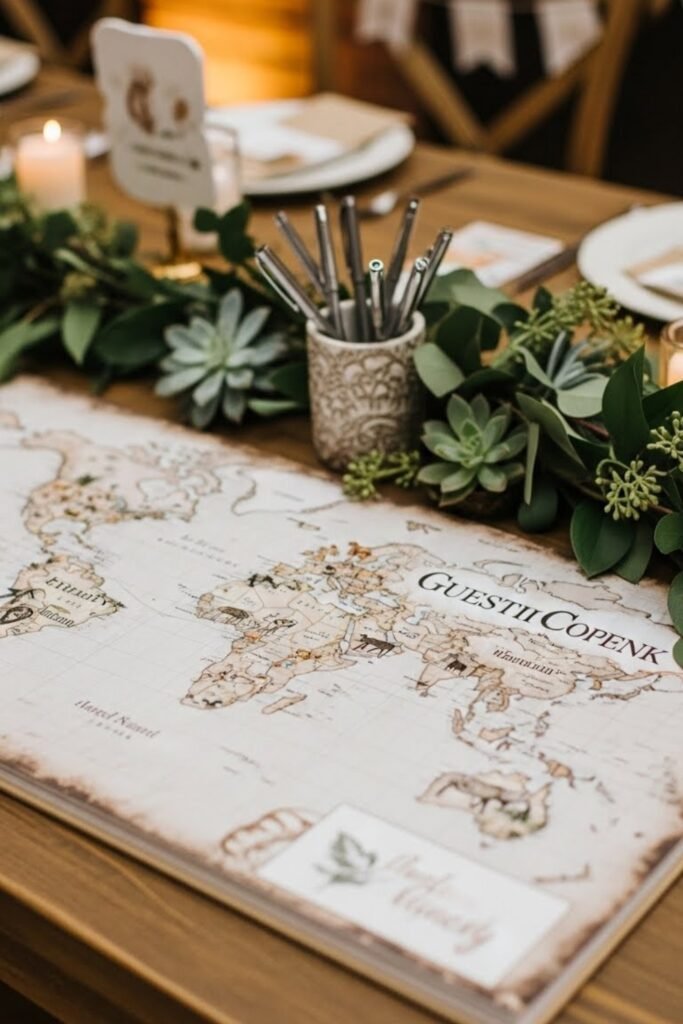 Replace a traditional guestbook with a printed safari-style map where guests can sign or leave short wishes.