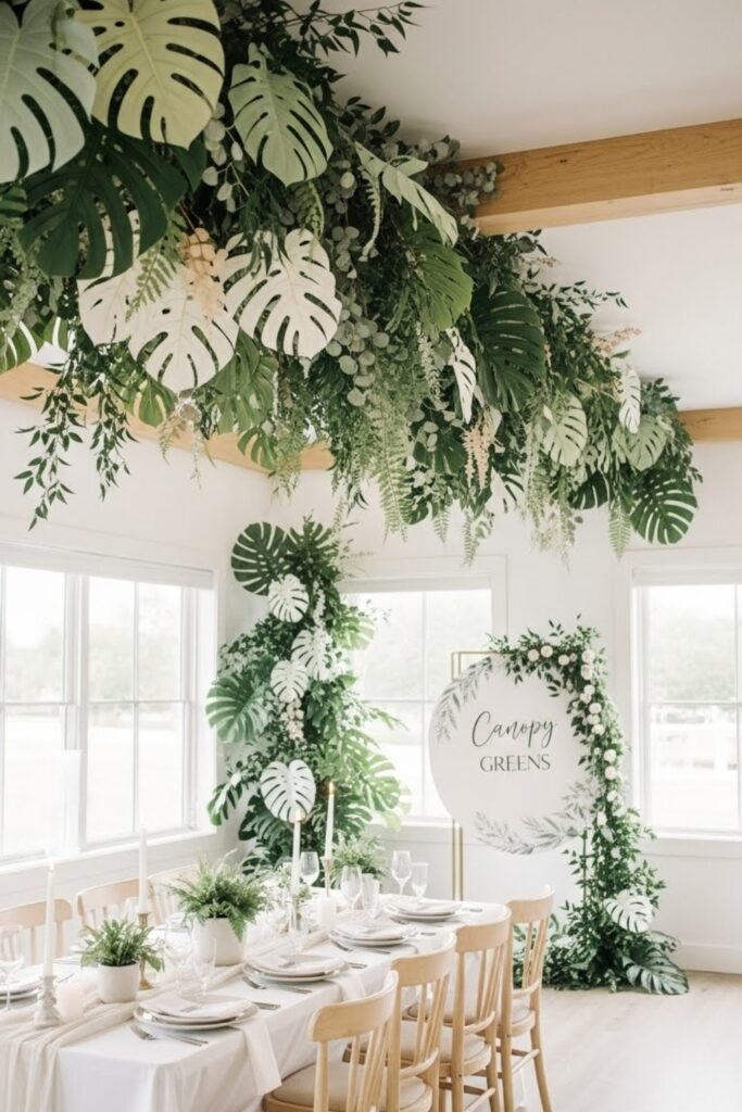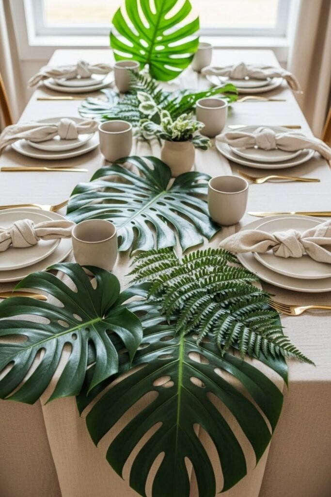 Dress tables with oversized tropical leaves layered down the center instead of fabric runners. Mix real or faux greenery for texture and depth.