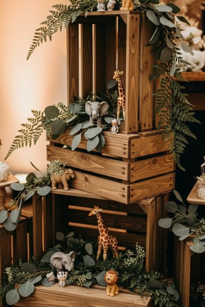 Use stacked wooden crates to display gifts, favors, or decor items. Style them with greenery and a few safari animal accents for balance.