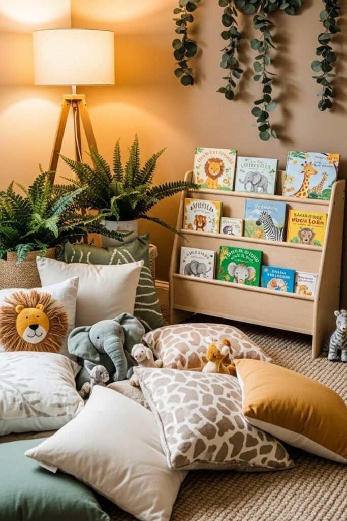 This idea fills empty spaces gently and ties the entire safari theme together without stealing focus from main decor pieces.