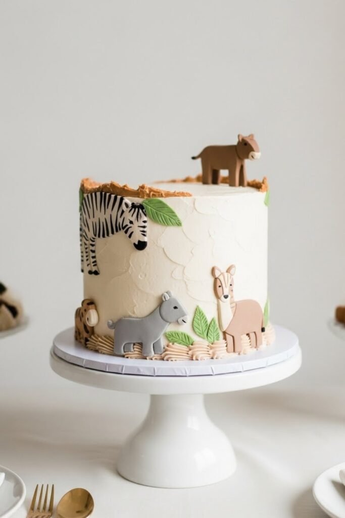 Design a clean, safari-inspired cake using subtle animal textures or toppers instead of loud prints. Think neutral frosting with small animal accents placed thoughtfully.