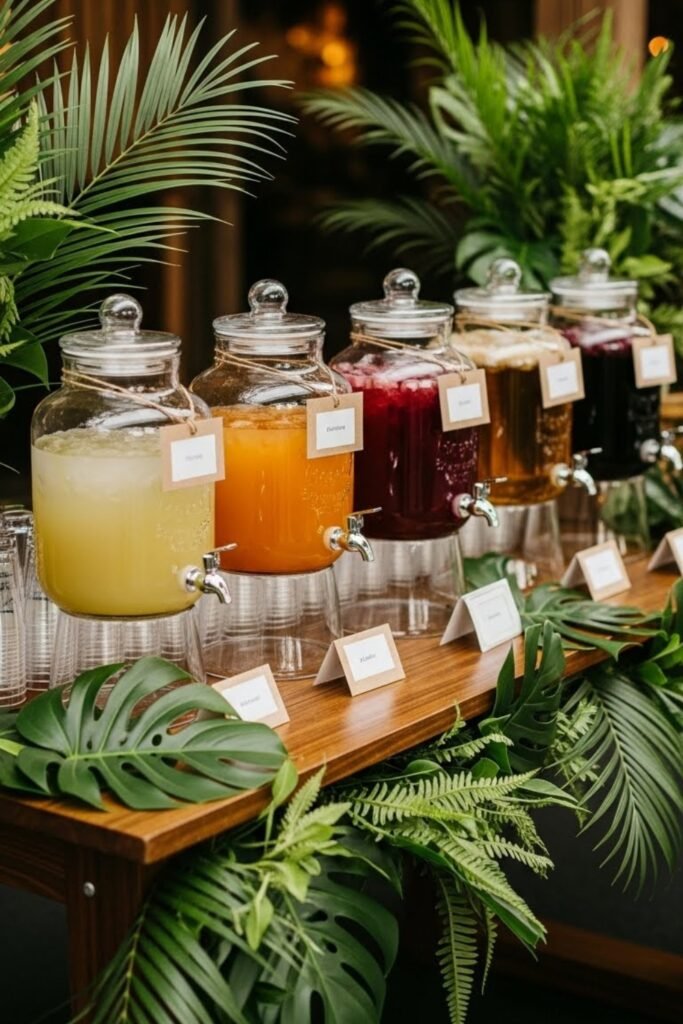 Create a self-serve beverage area styled like a jungle refreshment stop. Use glass dispensers, leafy accents, and simple labels with safari-inspired names.