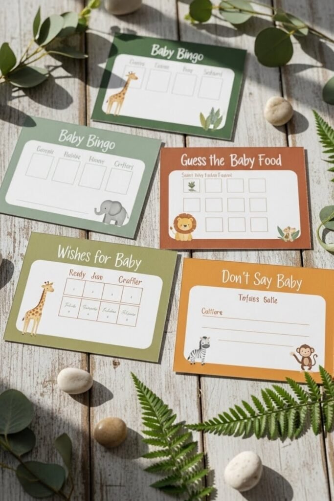 Design safari-themed activity cards like animal trivia or baby predictions using earthy colors. Keep the layout simple so they feel like part of the decor when placed on tables.