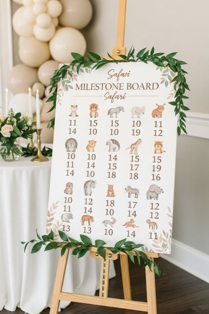 Display a board highlighting baby milestones using safari animal icons for each stage. This adds a personal, story-driven element to the shower.