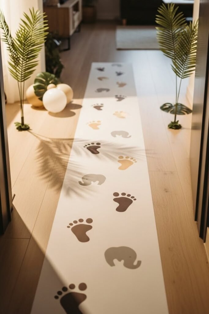 Create a playful path using animal footprints leading guests from the door to the main setup. Use removable floor decals or paper cutouts shaped like lion, elephant, or giraffe tracks.