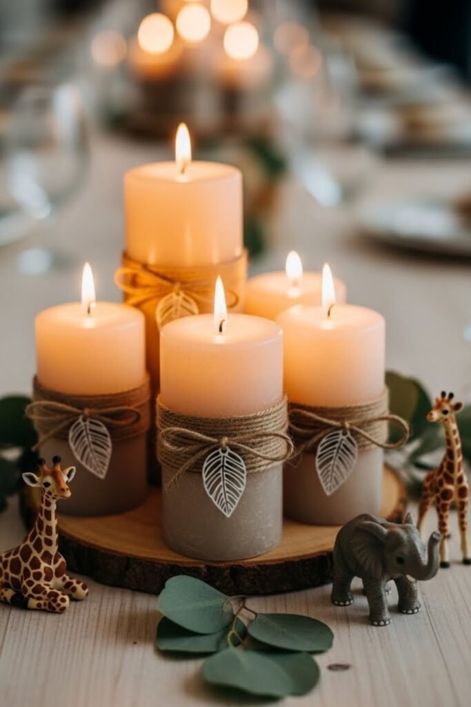 Use neutral-toned candles wrapped with simple safari-style labels or tied with twine and a tiny leaf charm. Arrange them in small clusters on tables or shelves for a warm, cozy glow.