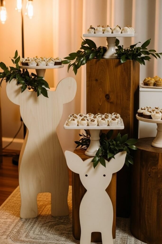 Display cupcakes, favors, or small decor pieces on animal-shaped or wooden pedestal stands. Keep the colors muted so the stands blend naturally into the safari theme.