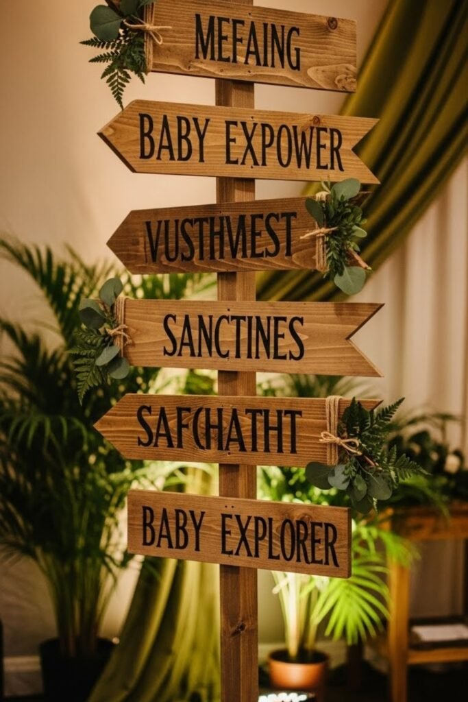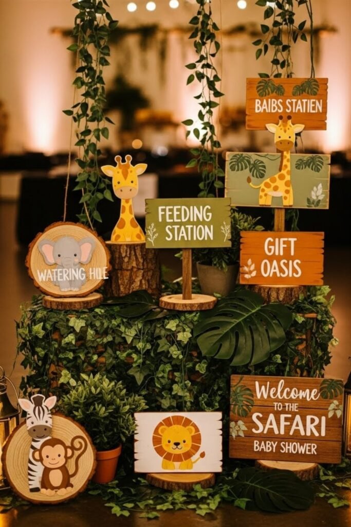 Use small wooden or cardstock signs styled like safari direction boards. Write playful messages such as “Baby Zone,” “Snack Camp,” or “Gift Station,” with arrows pointing the way.