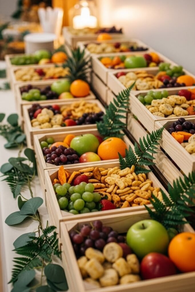 This setup feels adventurous and practical at the same time. Guests can easily grab snacks, and the crates double as decor, reducing the need for extra styling