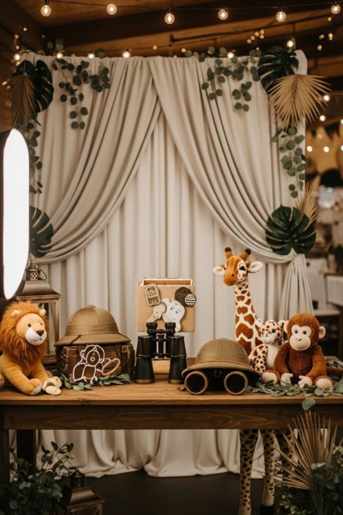 Create a cozy photo area with safari props like explorer hats, binoculars, and plush animals. Use a neutral backdrop with soft greenery instead of loud prints.