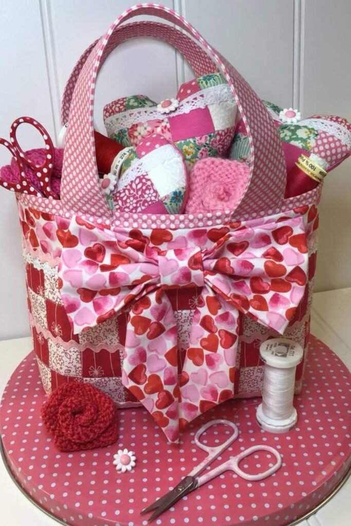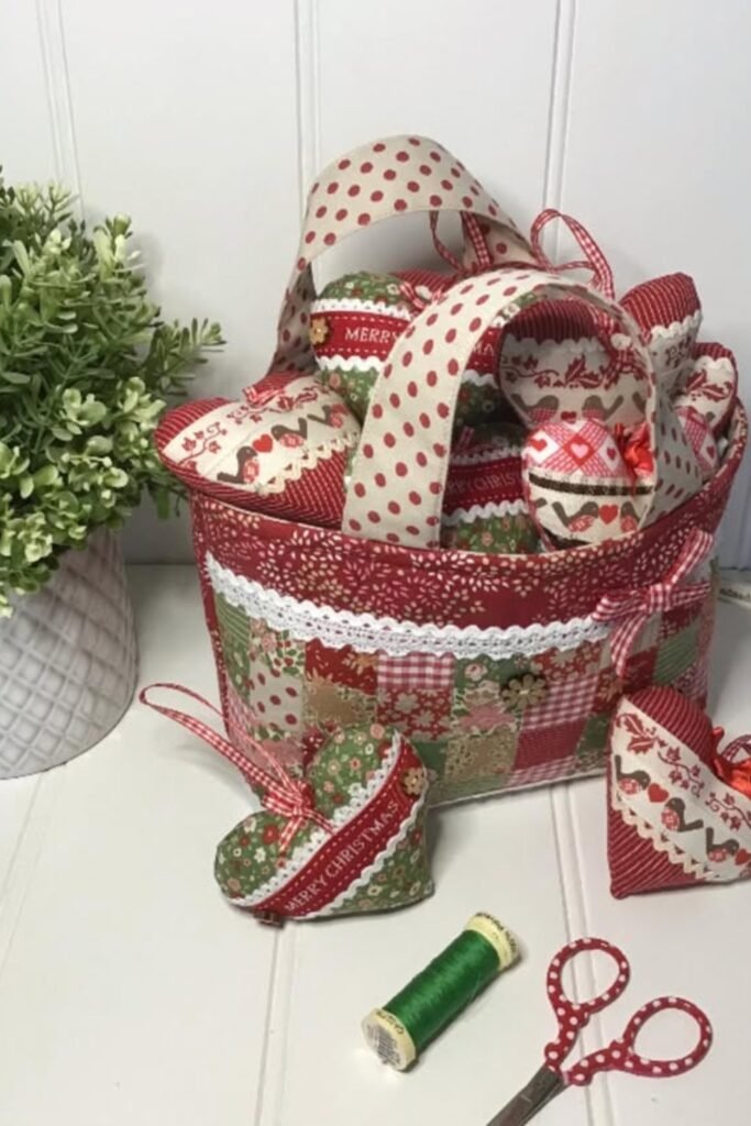 Construct a medium tote with holiday patchwork, then include small coordinating ornaments and heart motifs inside.