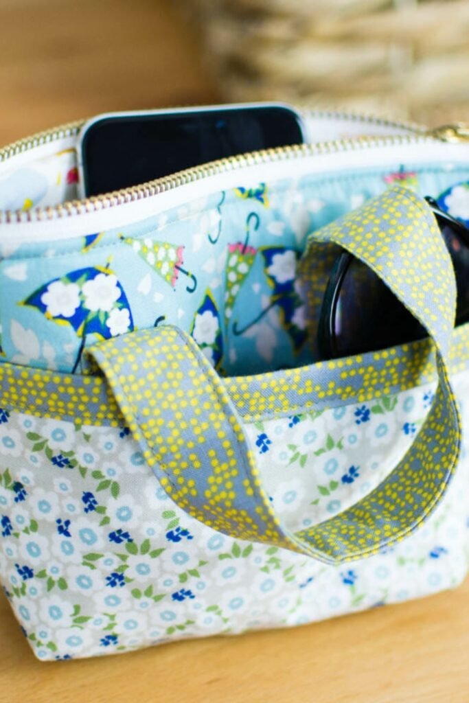 Build a boxed-bottom tote, insert interfacing for structure, then fill with coordinated handmade mini projects.