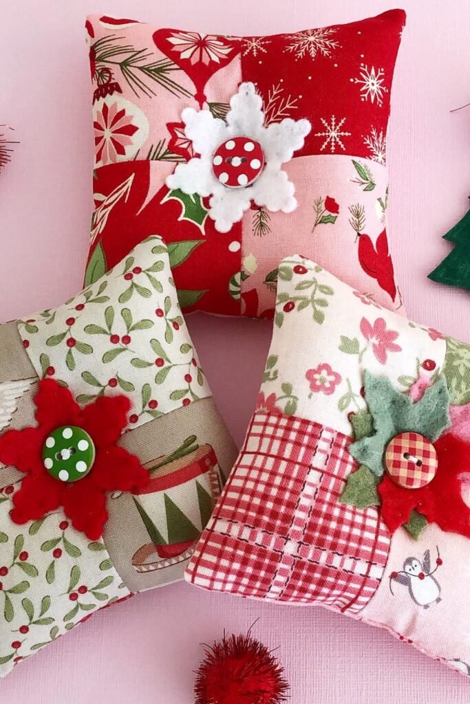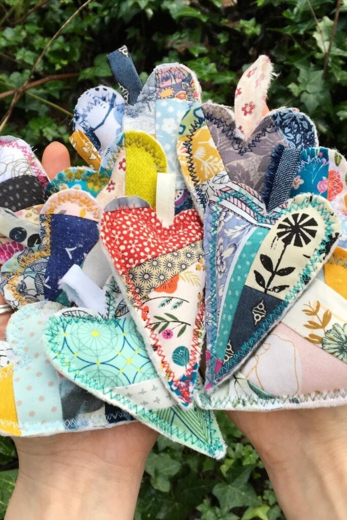 Layer mismatched cotton scraps, sew curved edges slowly, then stuff lightly so the shape stays soft without bulky corners.