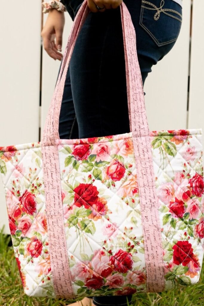 Floral quilting turns a simple tote into something sturdy enough for groceries yet soft enough for errands.