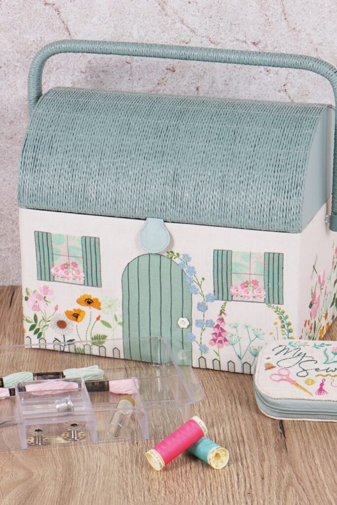 Thread and notions finally look charming when storage masquerades as a tiny fabric house on your workspace shelf display.