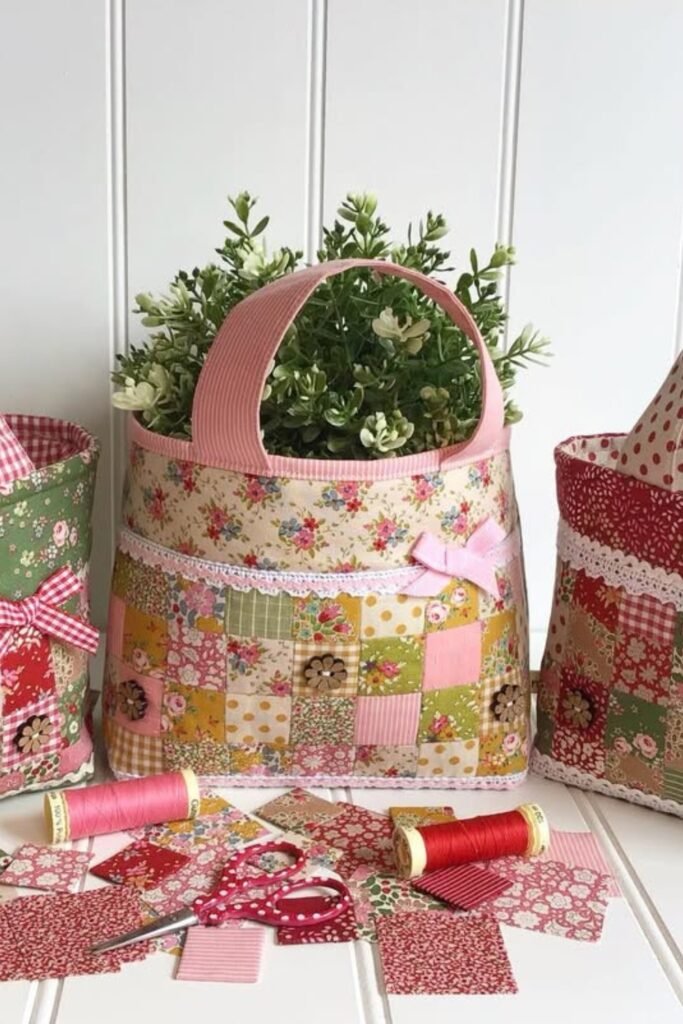 Houseplants look curated when wrapped in patchwork fabric baskets instead of mismatched plastic nursery containers on open shelves and windowsills.