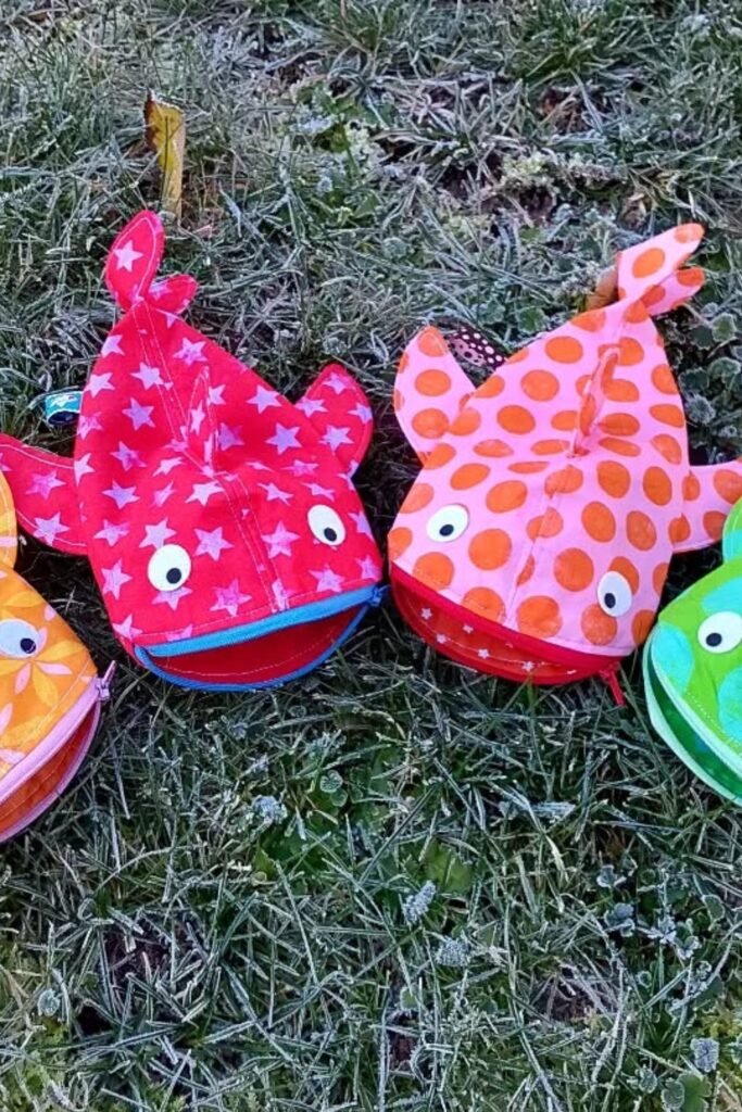 Shape the fish body with mirrored panels, insert zipper along the belly, then stitch cartoon eyes securely.