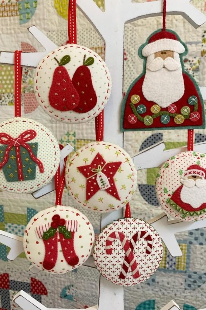 Fabric circles feel richer when tiny appliqué scenes replace flat printed Christmas patterns.
