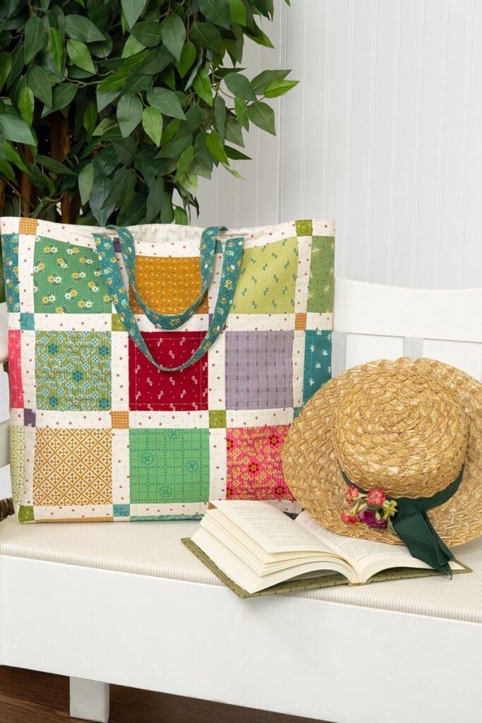 Color-block patchwork makes a simple tote into a statement bag that hides beginning mistakes and shows off fabric scraps in a stunning way.