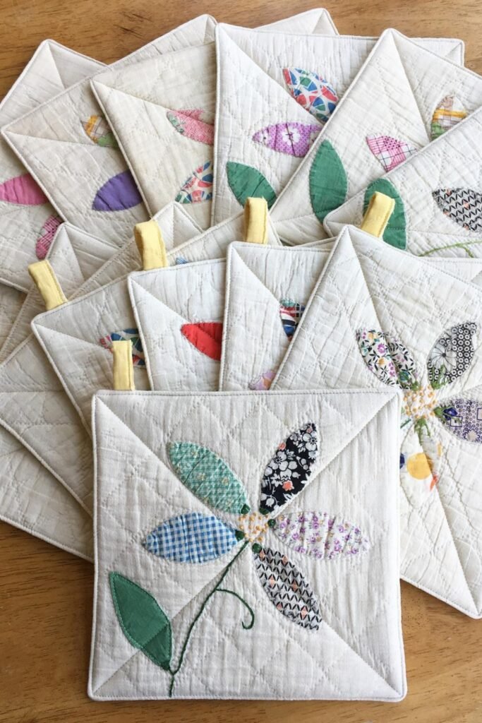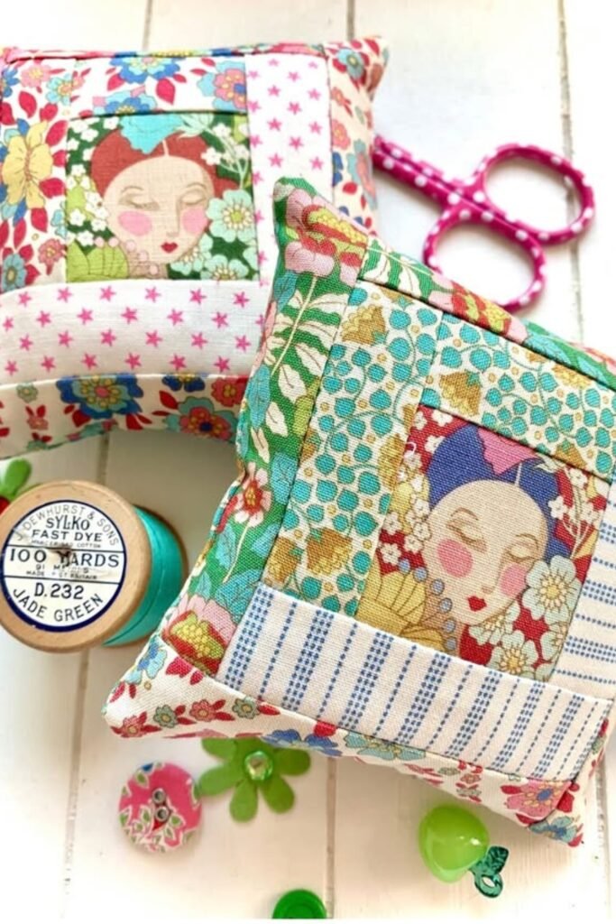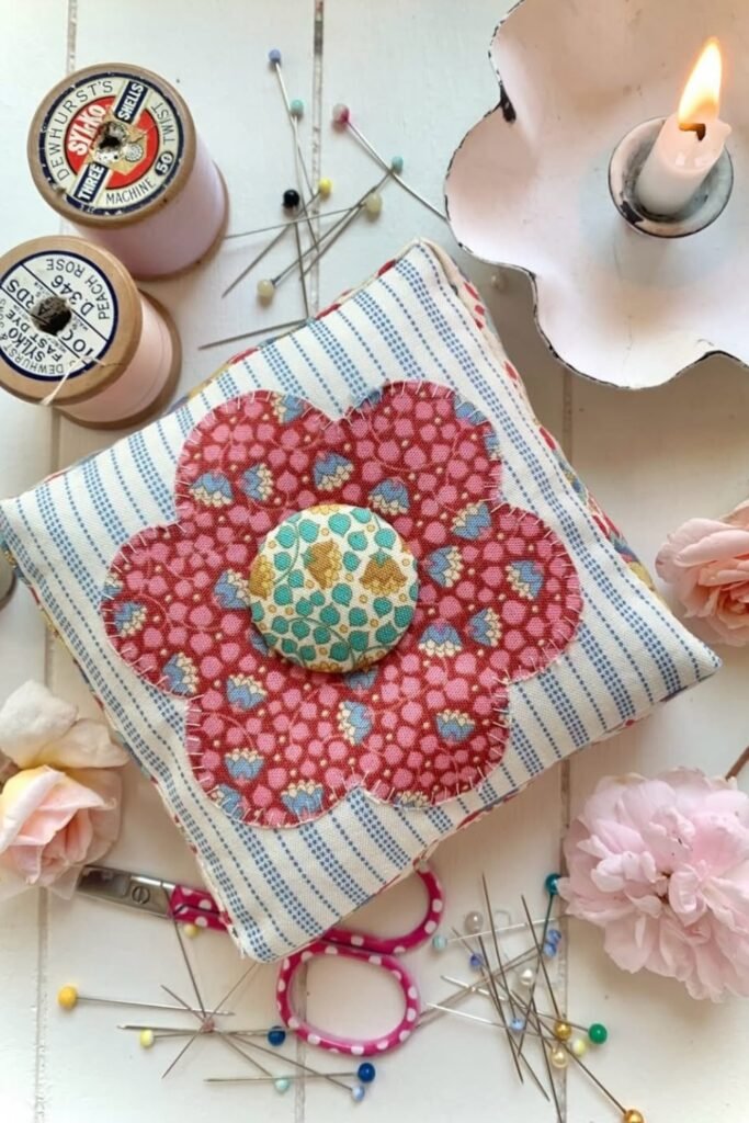 Scrappy floral layers swiftly turn leftover cotton into a cozy work companion that keeps needles visible, secure, and always within easy reach.