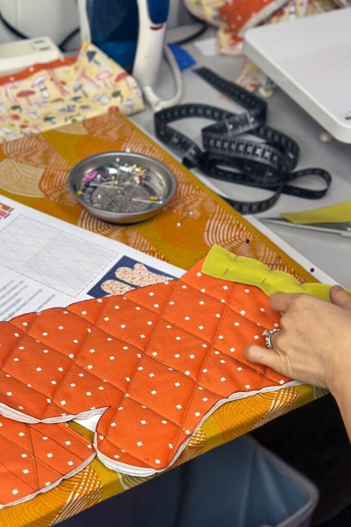 His polka-dot gloves turn saving your hands from heat into a fun endeavor, and straight-line quilting helps you gain control without having to shape any item.