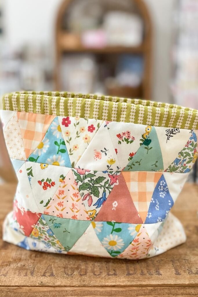 Angular patchwork pieces come together to make a soft standing basket that shows off mixed prints while yet being easy on beginning seams.