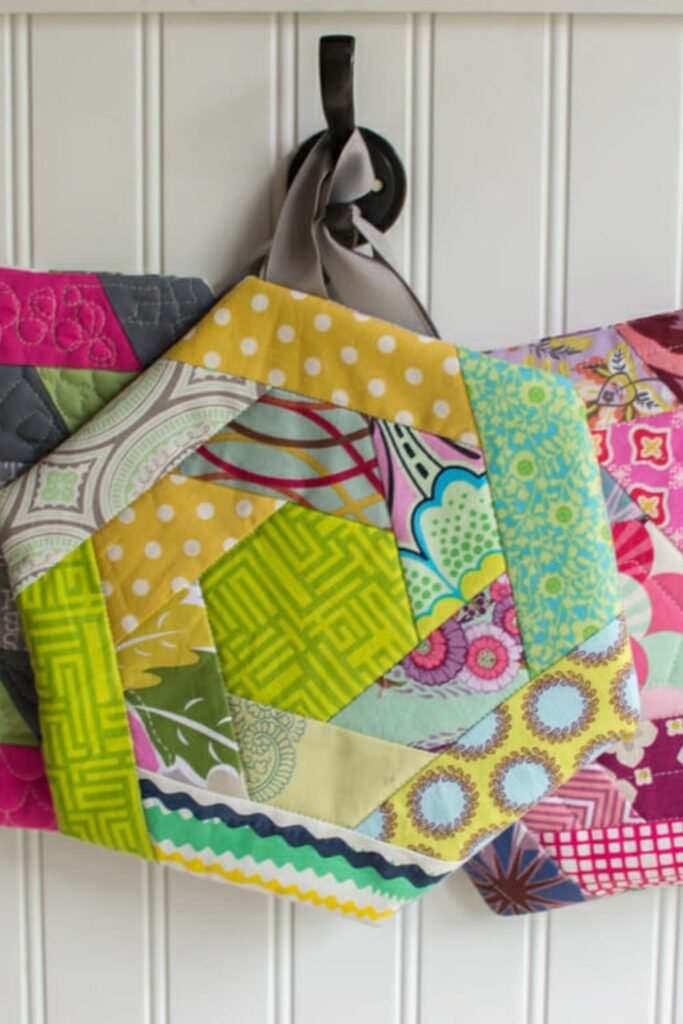 Wall hooks turn vivid patchwork pot holders into quick kitchen decor and keep heat protection close at hand instead of hidden away in storage.