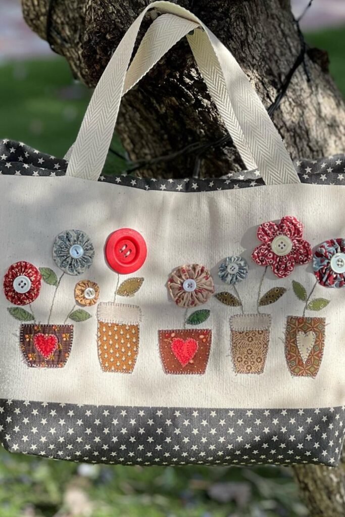 Buttoned flower appliqué makes a normal bag into a story piece that looks like it was made by hand, is fun, and is not perfect on purpose.