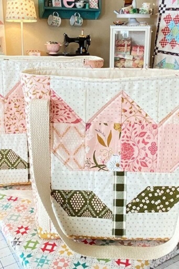 Soft pastel housing blocks turn plain tote panels into a fun streetscape that makes beginner piecing feel more like art than work.