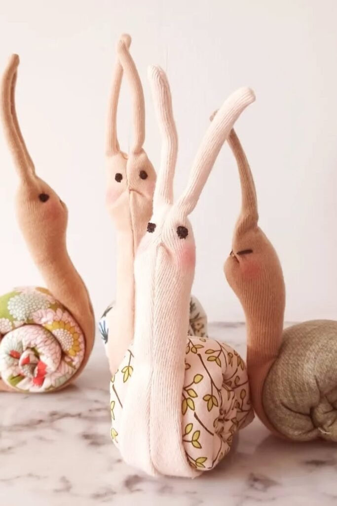 When you coil old socks tightly into spirals that look like shells, they become fun snails. You don’t need to fill them or make elaborate patterns.