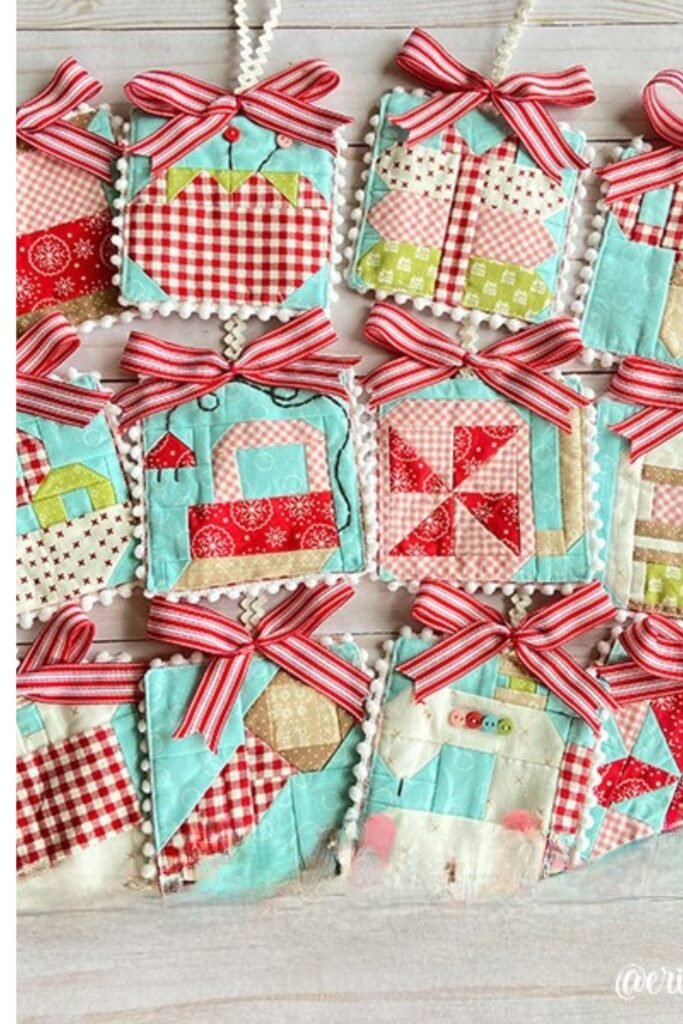 Small quilted houses make holidays feel cozy right away and let novices practice straight piecing, binding edges, and placing trim parts to layers.