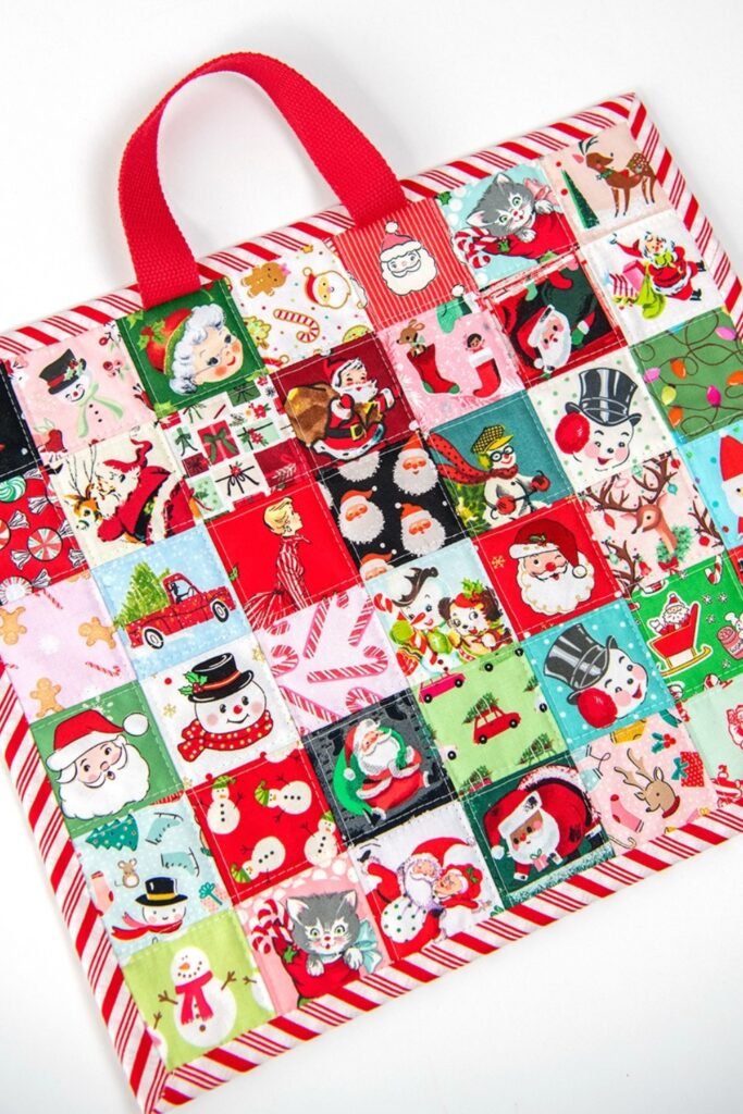 Stitching together holiday prints makes a fun tote out of fabric scraps that hides uneven seams and shows off how far you’ve come as a novice.