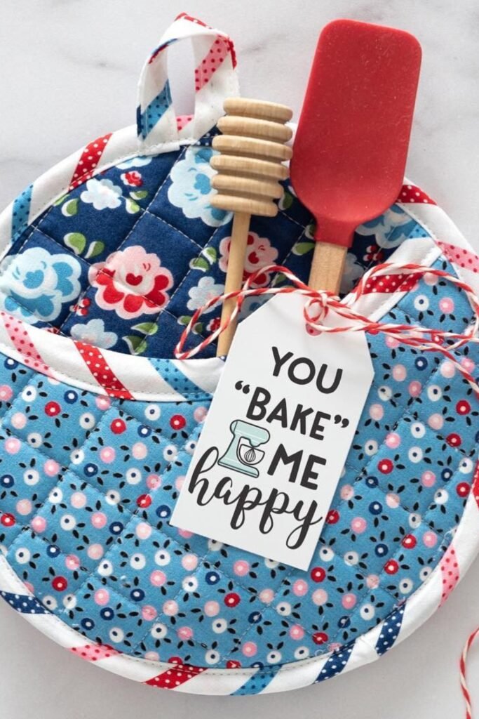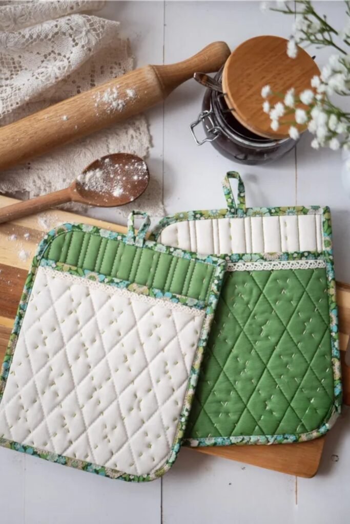When you have thick quilted pot holders with built-in pockets for utensils ready to go while you cook, the flour-dusted counters don’t seem as messy.